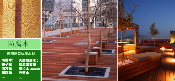 (防腐木有:南方松、紅雪松、花旗松、樟子松、芬蘭木、鐵杉、金絲柚木;賈拉木、印尼菠蘿格、巴勞、山樟、柳桉等)