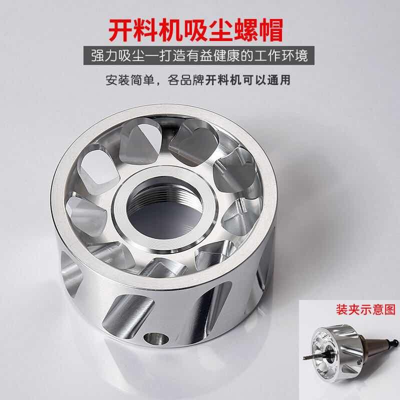 數(shù)控開料機,木工雕刻機,吸塵螺帽 本實用新型的優(yōu)點是替代鎖緊螺母夾緊刀具,加工時連體葉片靠近工件表面,切削刀具的高速旋轉使得連體葉片高速旋轉,產(chǎn)生向上旋風氣流,吸取刀具切削產(chǎn)生的塵屑,然后由防塵罩的抽風系統(tǒng)抽走塵屑,使得工件加工表面不會存有塵屑,延長刀具使用壽命,工作環(huán)境更環(huán)保安全?蓳Q螺母式旋風吸塵器連體葉片采用航空鋁合金材料,重量輕,強度高。合理的葉片角度,吸力好,風噪聲小,刀具主軸不會因為增加可換螺母式旋風吸塵器而影響加工精度的使用壽命。